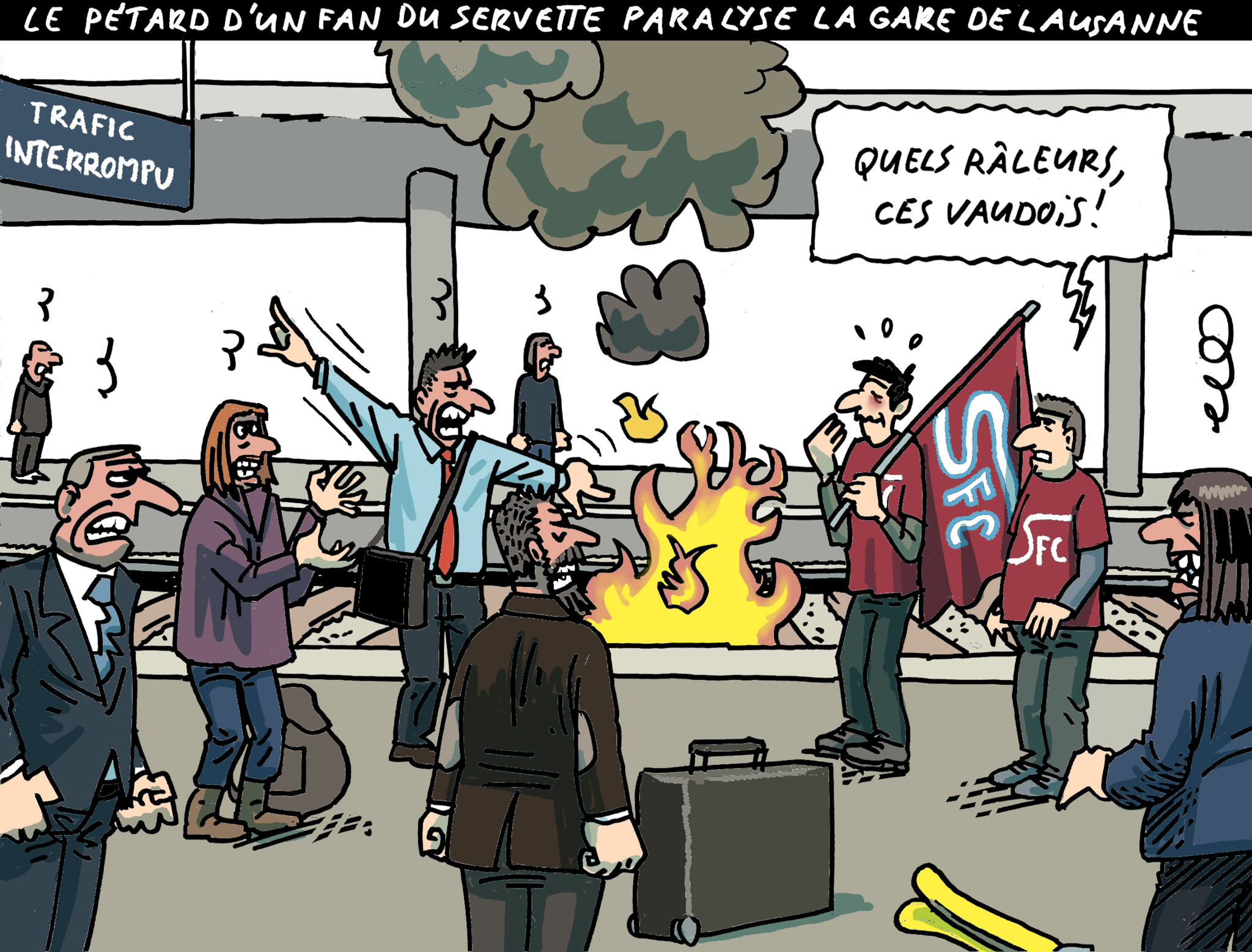• Dessin du 17 février: Le pétard d’un fan servettien paralyse la gare de Lausanne